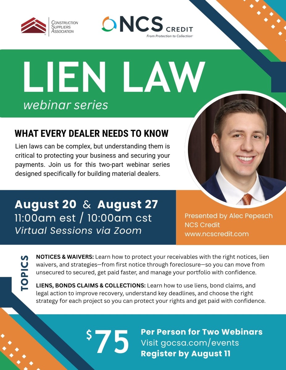 Better understand how to get paid and stay protected with our Lien Law Webinar Series. We simplify the essentials into practical, easy-to-follow steps so you can avoid costly mistakes, secure your lien rights, and navigate the process with confidence. Designed for all experience levels, these sessions turn complex rules into real-world solutions you can use immediately.